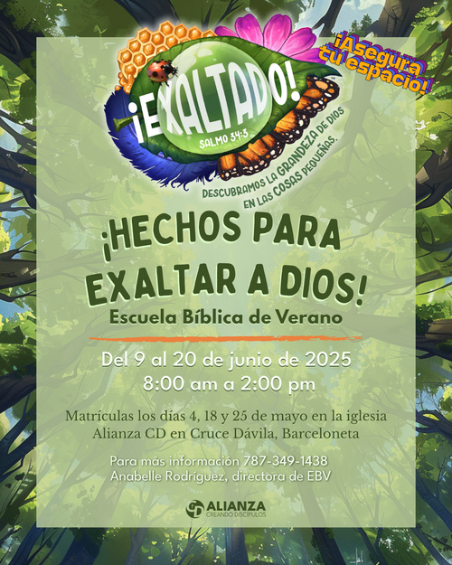 Edades de 6 a 12 años. Matrículas los días 4, 18 y 25 de mayo en la iglesia comenzando a las 10:00 am. ¡Asegura tu espacio!